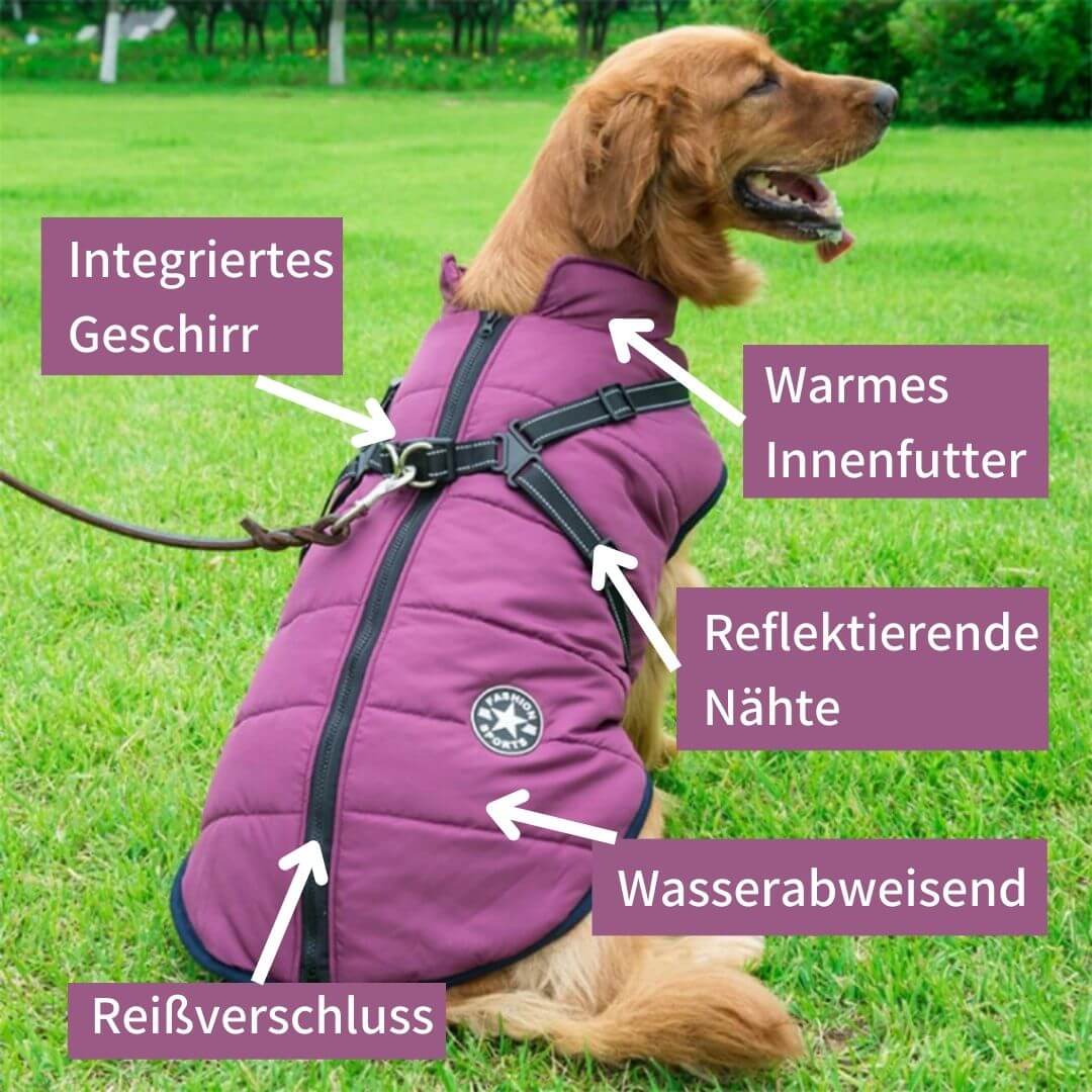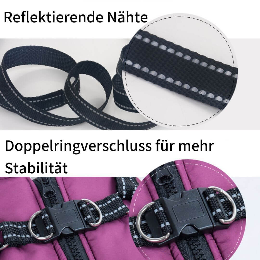 Reflektierende Nähte sorgen für Sicherheit in der dunkleren Jahreszeit. Das eingebaute Geschirr verhindert ein Ziehen im Halsbereich. Der ausgeklügelte Doppelringverschluss sorgt für zusätzliche Stabilität, wenn Du die Leine an der Jacke befestigst.