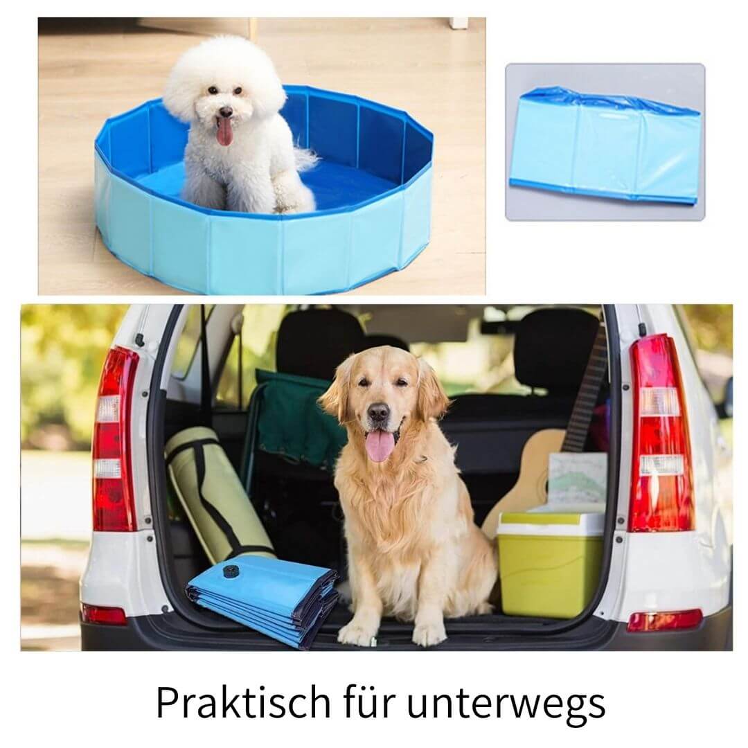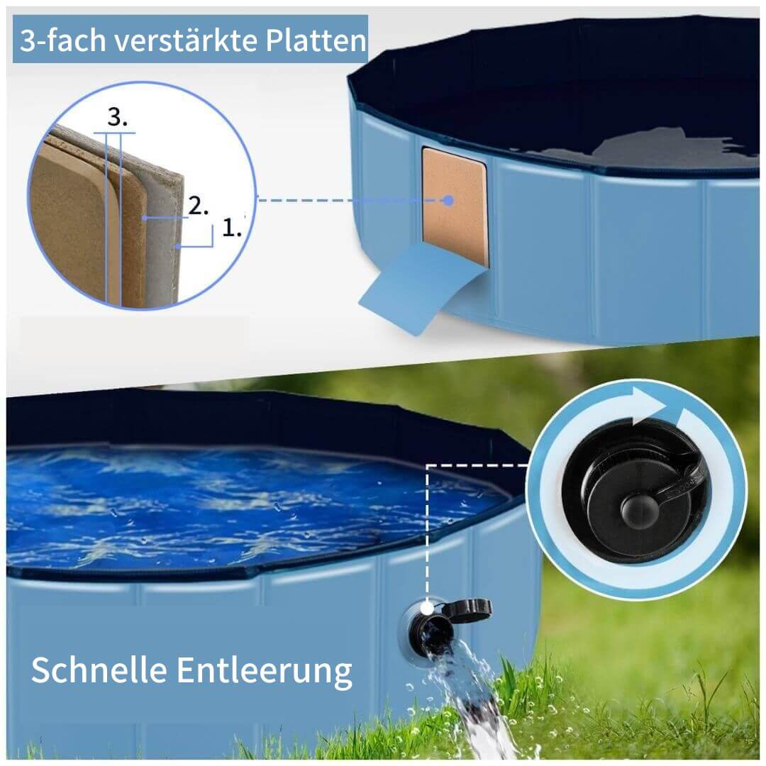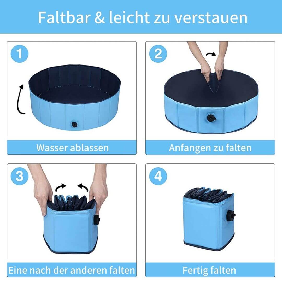 Zum Abbauen öffne die Ablassschraube, um das Wasser abzulassen. Wenn er leer und trocken ist, faltest du ihn einfach zusammen und packst ihn ein. Unser Hundepool ist leicht genug, damit Du ihn überall mit hinnehmen kannst.
